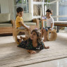 Banco com estrutura em madeira multilaminada Pinus ou Tauari com acabamento em verniz fosco soft touch atóxico. Produto entregue montado.