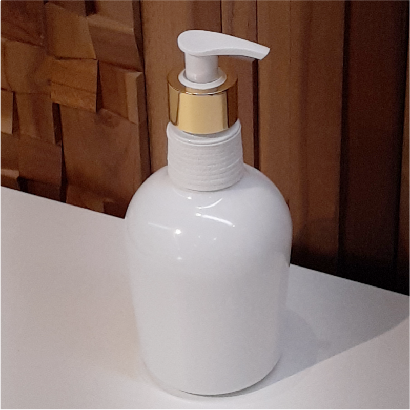 Dipenser para Sabonete Líquido em vidro branco com detalhe em couro branco, válvula/ pump branca com dourado.