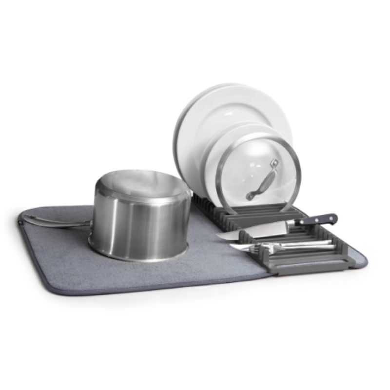 Um rack de secagem é uma cozinha essencial. O problema é que eles geralmente são grandes e volumosos para não mencionar um pouco de tristeza. Se isso não bastasse, eles enchem a cozinha e ocupam um espaço valioso no balcão, o que pode ser um problema real, especialmente em espaços pequenos e confinados. A alternativa é empilhar cuidadosamente os pratos com muito cuidado em um pano de prato molhado ou em uma toalha de chá velha. Até agora é isso. Prateleira UDry com tapete de secagem por Umbra Jogue o pano de prato e deixe o pano de prato, porque o UDry faz muito mais e fica bem ao fazê-lo! Com base em nossos produtos de cozinha de sucesso UDry e UDryMini, a Umbra expandiu a coleção UDry com o UDry Dish Rack com tapete de secagem.