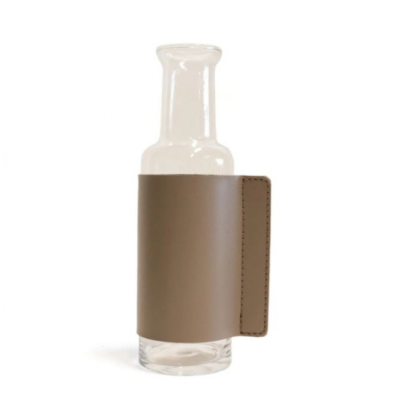 Garrafa de vidro com detalhe em material sintético.
