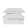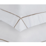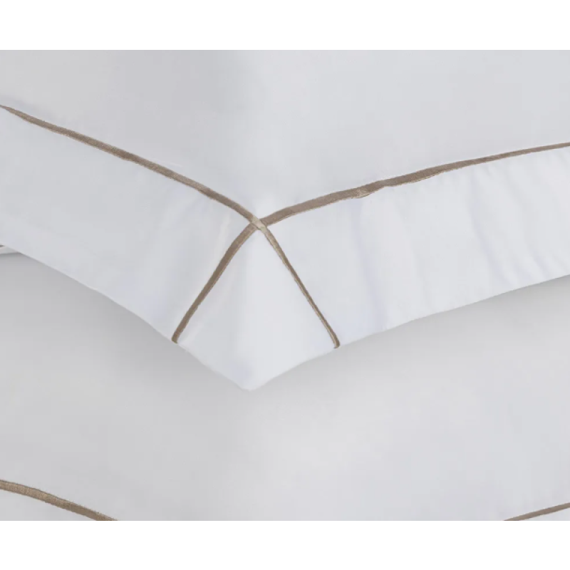 O sobre lençol, com 2,80 m x 2,80 m, exibe dobra feita com acabamento em ponto royal, assim como as duas fronhas de 50 cm x 70 cm com 3 abas. O lençol com elástico, de 1,93 m x 2,03 m x 40 cm, ajusta-se com precisão. A cor Branco com Nocciola imprime atemporalidade e elegância, traduzindo o equilíbrio entre natureza e design refinado.