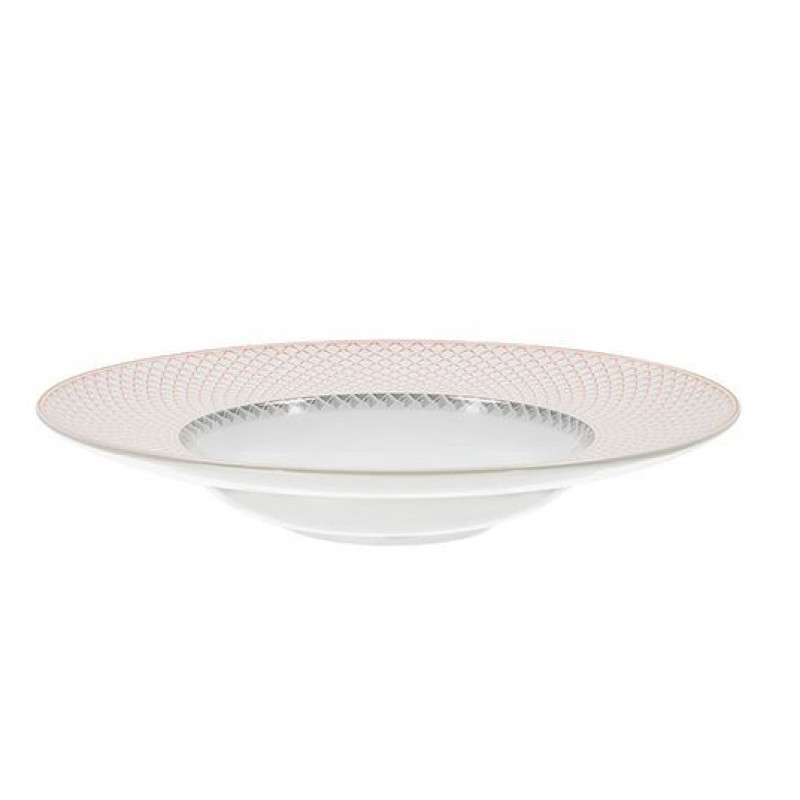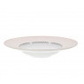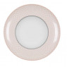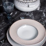 Set com 4 pratos rasos em porcelana da Coleção Maya, com fundo branco e com detalhes geométricos em tom de cinza e nude, pela Vista Alegre.