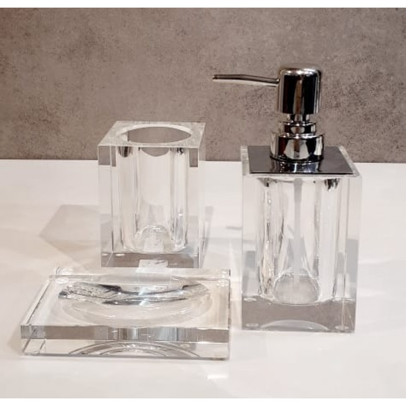 - Composto por 03 peças, sendo 01 saboneteira, 01 porta-escova e 01 dispenser para sabonete.