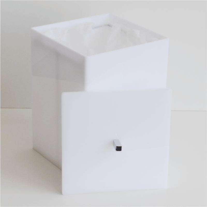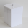 Lixeira quadrada com tampa com puxador cromado em acrílico com suporte interno para saco plástico.