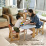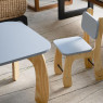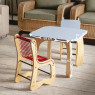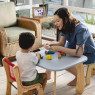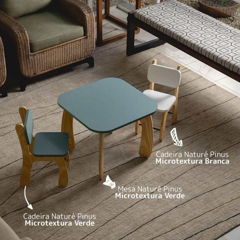 Mesa infantil com estrutura em madeira multilaminada com acabamento em verniz fosco soft touch atóxico e tampo em MDF (Medium Density Fiberboard) com acabamento em microtextura atóxica. Produto entregue montado.