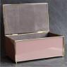 Caixa bege e dourada com revestimento de veludo na tampa e laterais, e fundo de espelho.