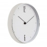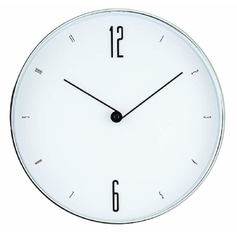 Relógio de parede em plástico na cor prata com acabamento brilhante, fundo na cor branca, números pintados de prata e ponteiros em metal na cor prata, frente do relógio em acrílico incolor.