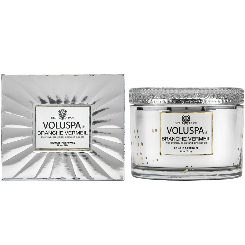 Do folheado a ouro ao recipiente metálico refletivo, esta vela exala classe de dentro para fora. Com uma homenagem ao design dos anos 1920, os detalhes são atemporais e repletos de glamour. O recipiente de vidro inclui uma tampa e será reutilizado por muitos anos.